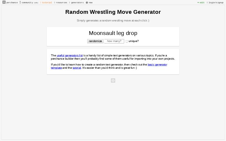 Choose from a list of names. Rum and Monkey isnt responsible for its content however good it. Title Random Wrestling Move Generator subtitle Simply generates a random wrestling move at each click fontSize 200 fontColor black buttonText randomize numberOfItems 1 itemSeperator description importsimple-gen-footer output.